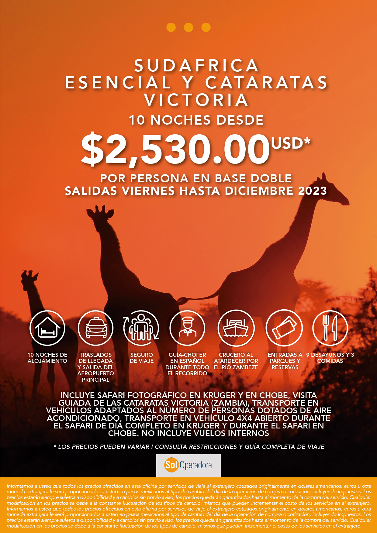 Informamos a Usted que todos los precios ofrecidos en esta oficina por Servicios de Viajes al Extranjero cotizados originalmente en Dólares Americanos o Moneda Extranjera, le serán proporcionados a usted en Pesos Mexicanos al tipo de cambio del día de la operación de compra o cotización, Incluyendo Impuestos, los precios estarán siempre sujetos a disponibilidad y a cambios sin previo aviso, los precios quedaran garantizados hasta el momento de la compra del servicio. Cualquier modificación en los precios se debe a la constante fluctuación de los tipos de cambio, mismos que incrementan el costo de los servicios en el extranjero.